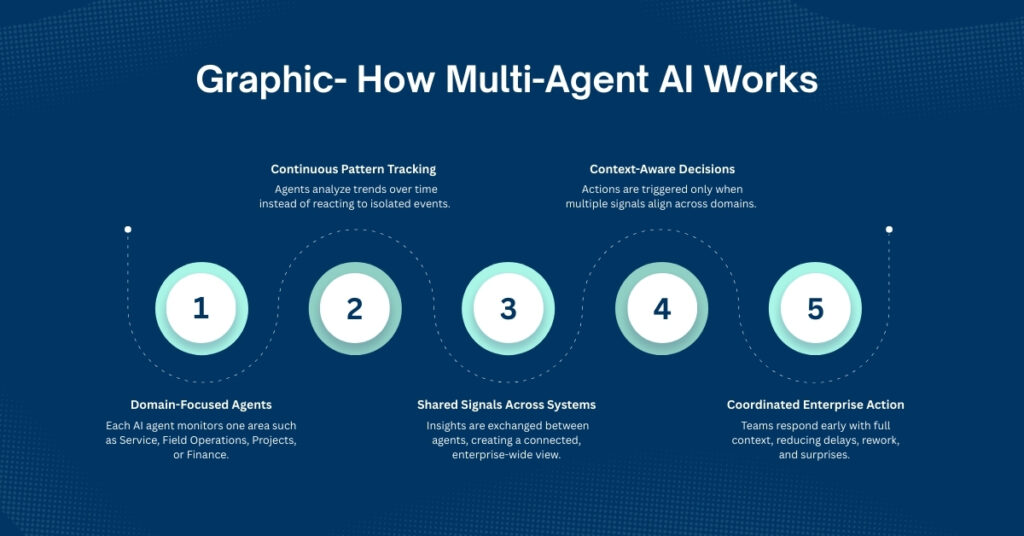A multi-agent AI system works differently. It uses several AI agents, each responsible for a specific area of the business. One agent may watch service activity; another tracks field operations. Similarly, another monitors projects or financial health.
