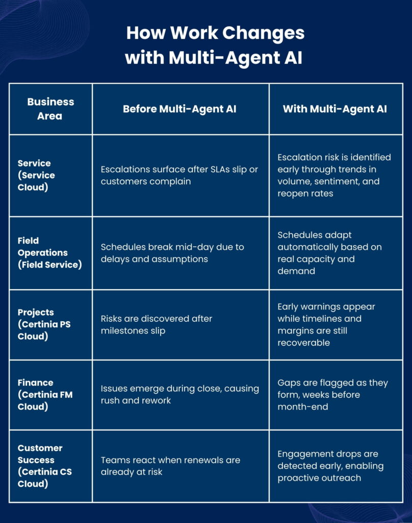 This approach is especially powerful in Salesforce ecosystems. Service Cloud, Field Service, Certinia PS, FM, and CS Cloud are tightly connected in real operations, yet they are often analyzed separately. Multi-agent AI bridges that gap, helping organizations see how service issues affect projects, how project delays impact finance, and how financial signals influence customer health.