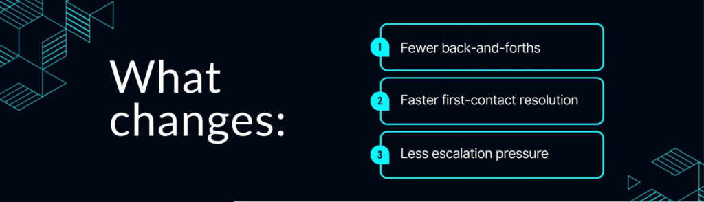 Instead of scanning long records, agents get a clear snapshot instantly. This reduces errors, shortens resolution time, and improves consistency across the team.