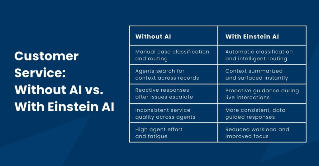 But Einstein AI delivers value only when it’s implemented with intent. Data must be clean, standardized, and connected. Workflows must reflect how teams operate. And AI must be tuned continuously as volumes, expectations, and service models evolve.